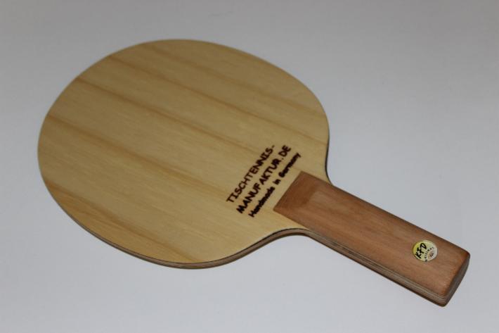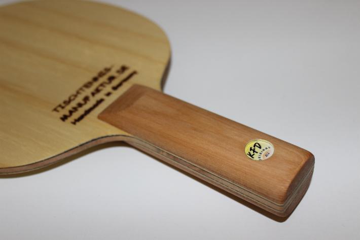 Das KFD Original ist aus 3 Holzschichten und 2 Carbongewebelagen aufgebaut. Durch die weichen Abachi-Deckfurniere und den dämpfenden Kern läßt es sich sehr gefühlvoll und kontrolliert in der Defensive und im Kurz-Kurz spielen, die Carbonverstärkung sorgt für die nötige Härte für Zwischenattacken und einen knackigen Ballanschlag. Der recht flache Ballabsprung des Original ermöglicht sicheres Retournieren aus der langen Verteidigung ebenso wie ein variables und präzises Blockspiel am Tisch.